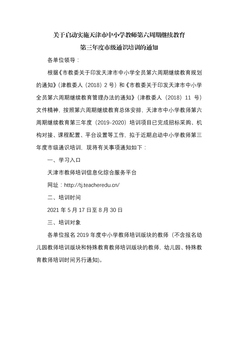 关于启动实施天津市中小学教师第六周期继续教育市级通识课的通知